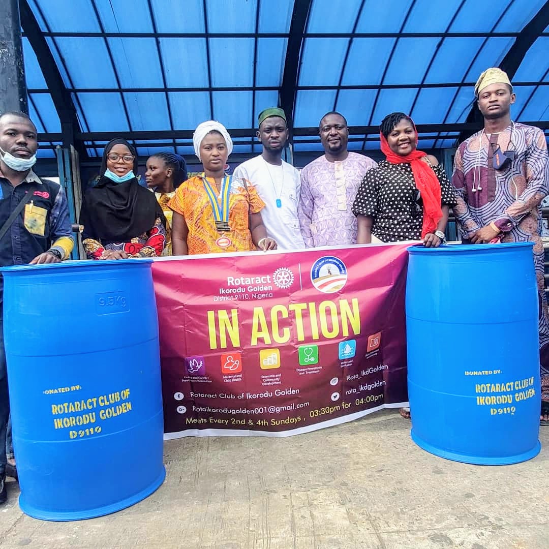 The Rotaract Club of Ikorodu Golden District 9110 donated two waste bins to the BRT Terminal at Ikorodu Garage for use by the commuters for the purpose of waste Disposals in a bid to have a cleaner and healthier environment.