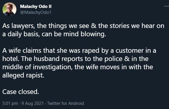“A wife claims she was raped by a customer in a hotel. The husband reports to the police and in the middle of the investigation, the wife moves in with the alleged rapist, Case closed,” Malachy Odo wrote