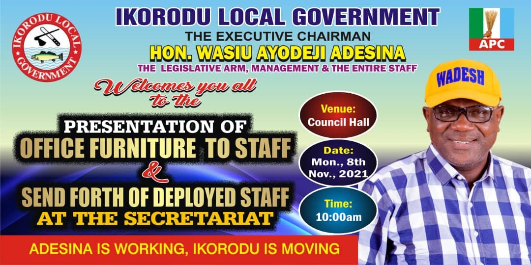 Hon Wasiu Adesina, Executive Chairman Ikorodu local government declared in a brief consultation with INN that personnel in the LG secretariat will be endowed with 100 office tables and chairs on Monday 8th November 2021, as the council boss commemorates his 100 days as returning chairman to the bureau.