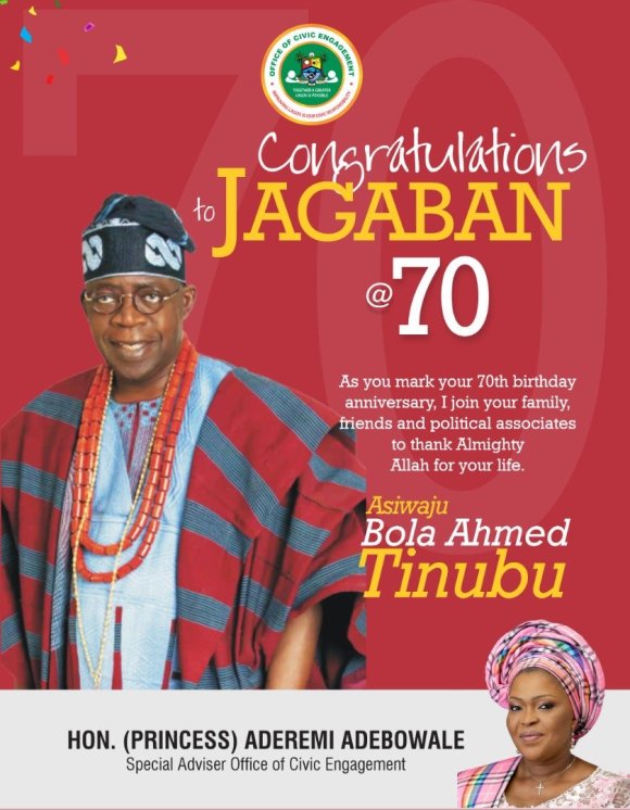 Special Adviser on Civic Engagement to the Lagos State Government, Hon. (Princess) Aderemi Adebowale has extolled Former Lagos governor, Bola Tinubu as an irreplaceable mentor and leader worthy of celebration and emulation.