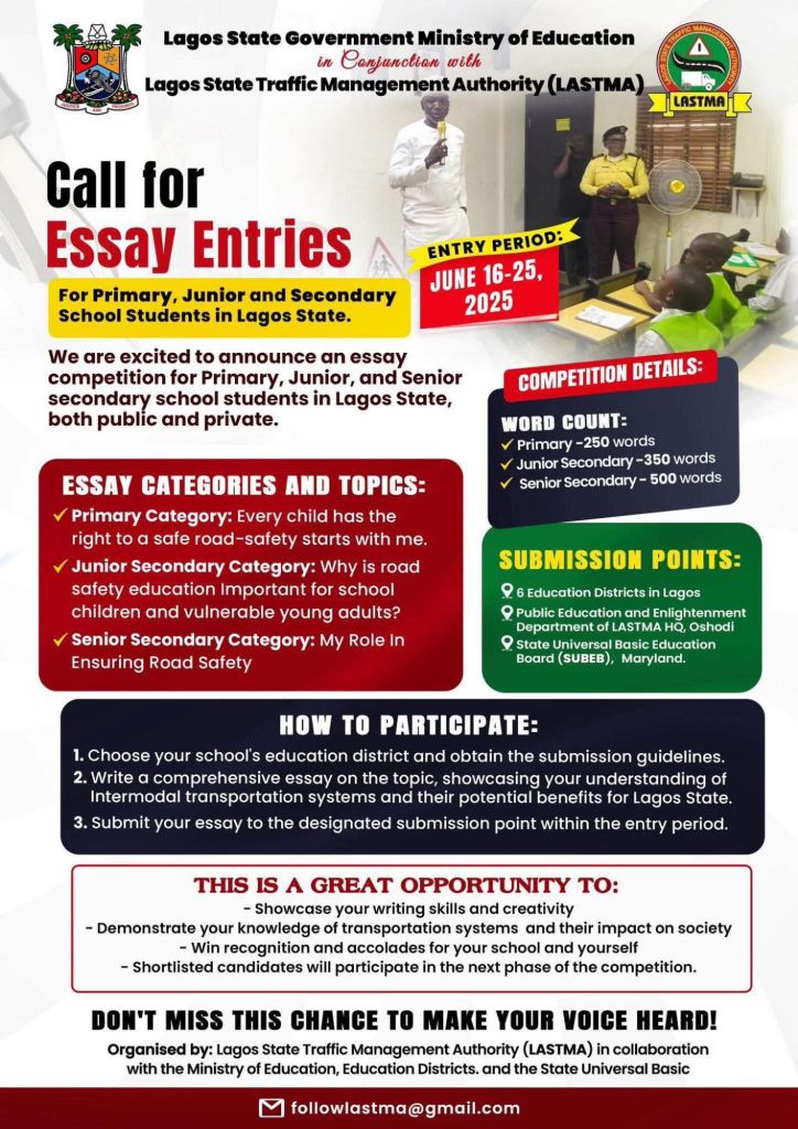 Announcing the initiative on June 16, 2025, LASTMA described the competition as an exciting opportunity for students to share their ideas on how to make Lagos roads safer for everyone, particularly around schools.