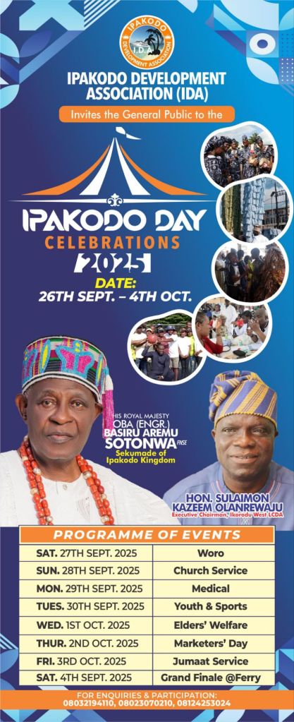 The 2025 celebration will be hosted under the royal patronage of Oba (Engr.) Basiru Aremu Shotonwa, Sekumade of Ipakodo Kingdom, with Hon. Sulaimon Kazeem Olanrewaju, Executive Chairman of Ikorodu West LCDA, serving as Chief Host.