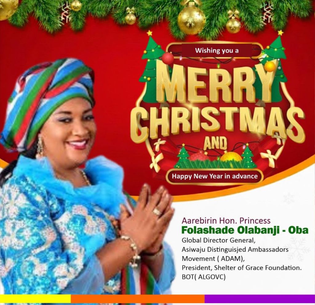 Aarebirin Hon. Princess Dr. Folashade Olabanji-Oba, the Global Director-General of the Asiwaju Distinguished Ambassador Movement (ADAM), President of the Shelter of Grace Foundation, and a member of the Board of Trustees of ALGOVC, has extended heartfelt Christmas goodwill messages to Nigerians and friends across the globe, calling for renewed commitment to love, unity, and service to humanity.